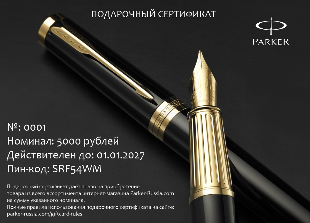 Подарочный сертификат Parker 5000 от официального дилера Parker в Серпухове. Вы можете дополнительно заказать гравировку, которая подчеркнет Вашу оригинальность и придаст памятность статусному подарку. Все ручки Паркер поставляются в фирменном футляре.